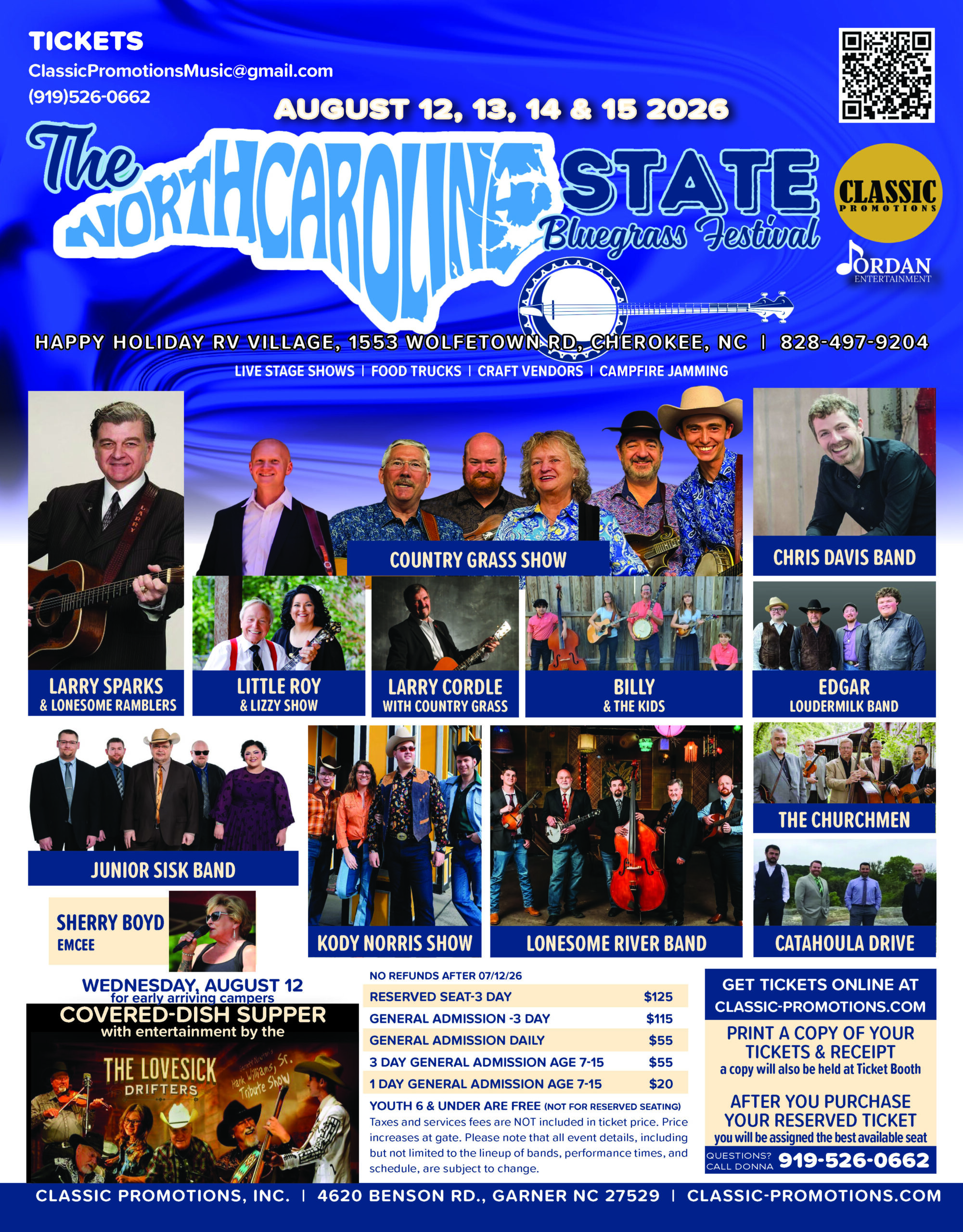 Happy Holiday RV Village 1553 Wolfetown Rd, Cherokee, NC, United StatesFor tickets or more information on the North Carolina State Bluegrass Festival click here to visit Classic Promotions