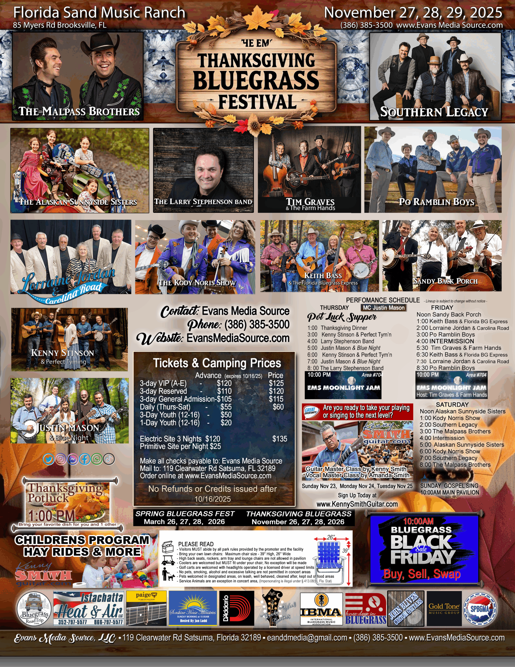 Florida Sand Music Ranch 85 Myers Rd, Brooksville, FL, United StatesA New EMS Experience! Friday 11/21/25-Sunday 11/23/25 See the Daily Schedule Here There is a non-refundable processing fee on all credit card purchases. There is a $20 non-refundable fee on…